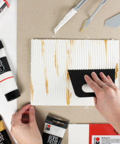 No home should be without pictures. They add cosiness and provide the finishing touch. Textured pictures with a 3D effect are particularly popular and are easy to create yourself with the Marabu Structured Art “All-in-One” set. Apply the acrylic pastes generously to the painting surface and then use the effect spatulas to form individual patterns. The relief structure in combination with the modern off-white finish of the acrylic pastes creates a sophisticated yet calm and modern effect. The Acrylic Paste Gold can also be used to create very special colour accents, as it can be filled or used to paint over the white pastes. There are no limits to creativity. The pastes are water-based, have good coverage, are lightfast, ideal for stencilling and can be combined without any problems. Drying time: 2-24 hours depending on the thickness of the application.