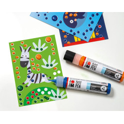 Create imaginative works of art with the Dot Pen KiDS Set “Animals”! The set contains 4 x 25 ml liners in a selected colour combination, instructions and five exclusive colourful design cards in postcard format that can be individually dotted with the dot pens. The DIN A6 design cards are printed in colour with motifs suitable for children. Depending on the amount of colour applied, the dot size of the self-forming dot paint varies.