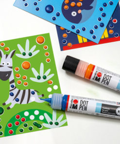 Create imaginative works of art with the Dot Pen KiDS Set “Animals”! The set contains 4 x 25 ml liners in a selected colour combination, instructions and five exclusive colourful design cards in postcard format that can be individually dotted with the dot pens. The DIN A6 design cards are printed in colour with motifs suitable for children. Depending on the amount of colour applied, the dot size of the self-forming dot paint varies.