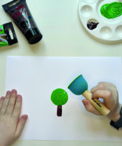 The 2 robust stippling brush and 4 painting sponge are ideal for stamping, stencilling and blotting shapes. Butterflies and bees flutter and buzz through a garden full of flowers and trees while the sun beams down on the house and a brightly coloured dot caterpillar crawls across the lawn – kids’ imaginations know no bounds with this sponge stamp set.