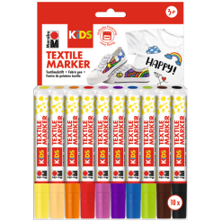 A T-shirt with your own name or your favourite superhero: With Marabu KiDS fabric markers in 10 bright colours (yellow, rosé beige, orange, red, pink, purple, blue, green, brown, black), cotton basics can become unique pieces you won’t find anywhere else! Bright fabric markers for creative designs on t-shirts, baseball caps, bags and other accessories. For painting light-coloured, finish- and fabric-softener-free fabrics up to max. 20% synthetic content. After fixing, washable up to 60 ° C. Store flat. Fixing: Once dry, iron each area on the reverse for 3 min at cotton temperature or fix in a pre-heated oven (8 min./150 ° C).