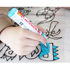 • Сетот содржи: 10 x 25 мл KiDS Window Color (Orange 013, Yellow 019, Ruby red 038, Medium brown 046, Dark ultramarine 055, Light green 062, White 070, Azure blue 095, Violet 251, Outline-black 073), 1 x А4 лист со шаблони со 18 дизајни