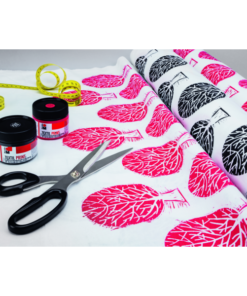 In relief printing, the printing areas are raised, which means that only the raised lines, gutters or surfaces of the printing plate are printed. The soft printing plate is very easy to use. It is a direct printing process, i.e. the printing plate transfers the ink directly onto the fabric. Therefore, the motif has to be its mirror image on the printing plate. Transparent watercolours are diluted with water and applied to the fabric with a wet brush. Water-based, saliva-resistant, washable to 40 °C, and soft to the touch. For light-coloured fabrics free of finishes and fabric conditioners (max. 20 % synthetic fibre). After drying, fix in the oven (150 °C/8 minutes), or iron for 3 minutes without steam. Stir paints before use and wash tools after use in water.