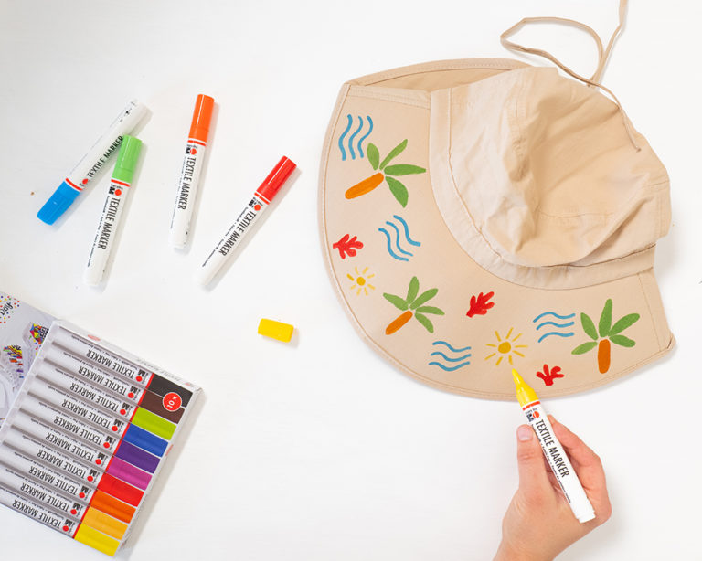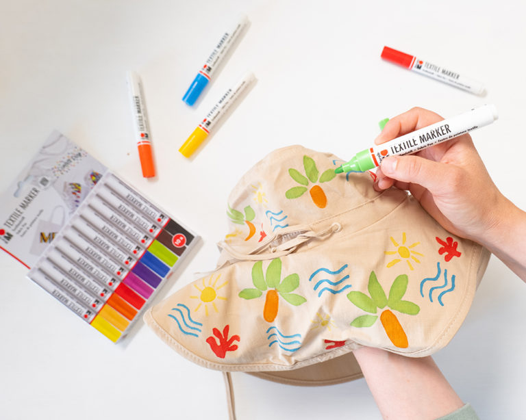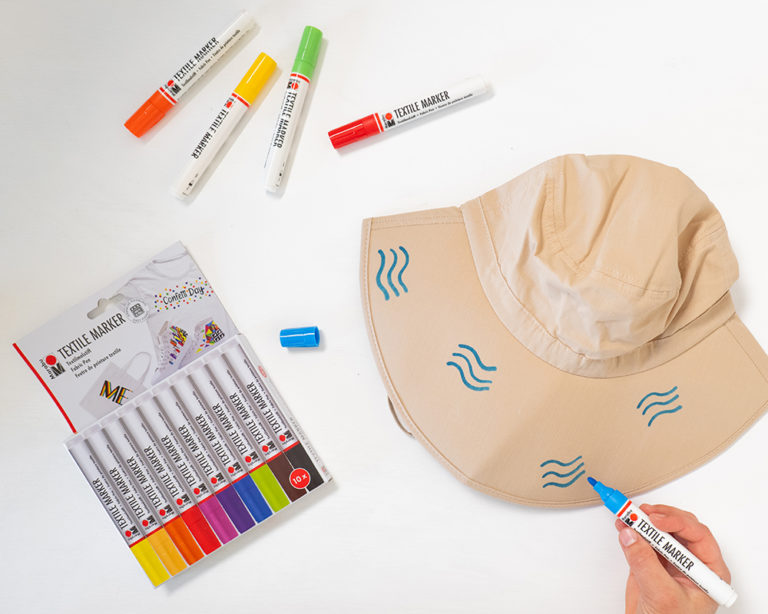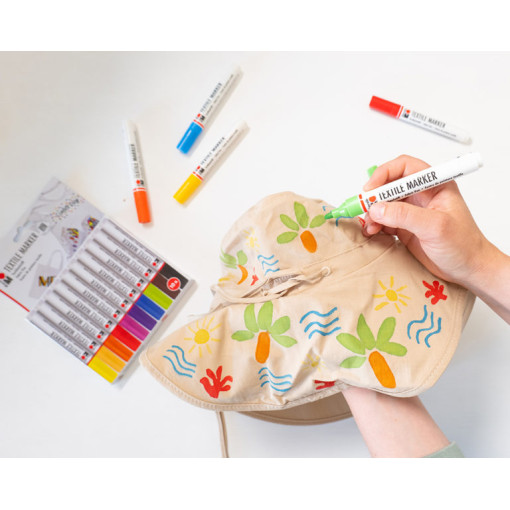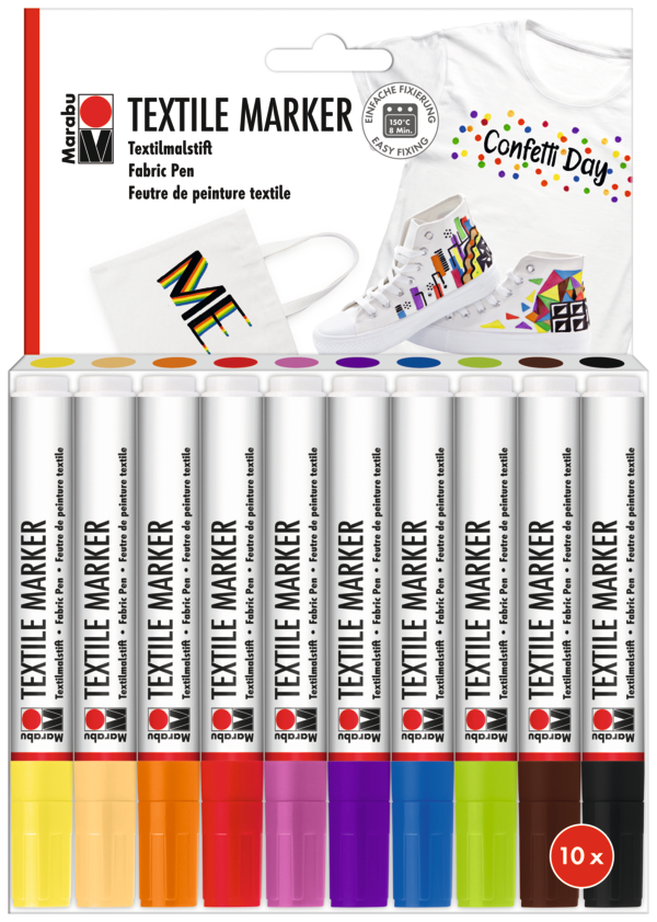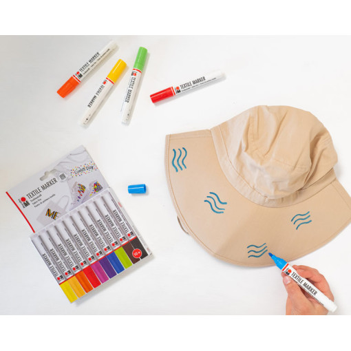 A T-shirt with your own name or your favourite superhero: with Marabu fabric markers in 10 bright colours (yellow, rosé beige, orange, red, pink, purple, blue, green, brown, black) cotton basics can be turned into unique pieces you won’t find anywhere else! Bright fabric markers for creative designs on t-shirts, baseball caps, bags and other accessories. For painting light-coloured, finish- and fabric- softener-free fabrics up to max. 20% synthetic content. After fixing washable up to 60 ° C. Store flat. Fixing: once dry, iron each area on the reverse for 3 min at cotton temperature or fix in a pre-heated oven (8 min./150 ° C).