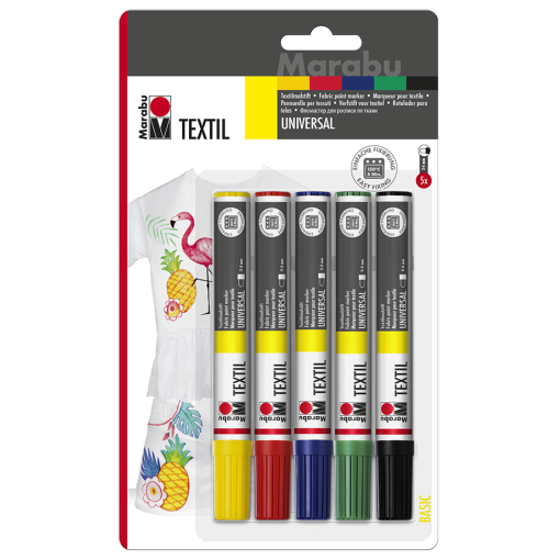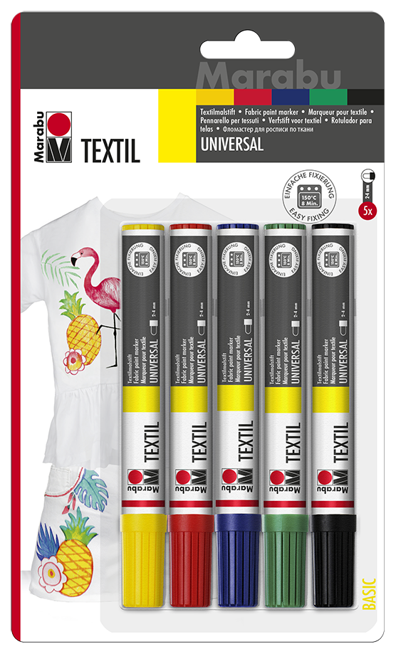 The Marabu Textil Painter makes dreams come true! It has never been so easy to turn light-coloured fabrics into unique, colourful textiles. The basic set contains 5 Textil Painters in the basic colours with a 2-4 mm paint tip. Instructions and great templates are already on the packaging and give all aspiring fashion designers some initial inspiration and creative ideas. The easy handling of the high-quality Marabu textile markers help you create true masterpieces on your textiles. You will be amazed at your own creativity! The fabric markers are water-based so that even little ones can become the next great fashion designers!