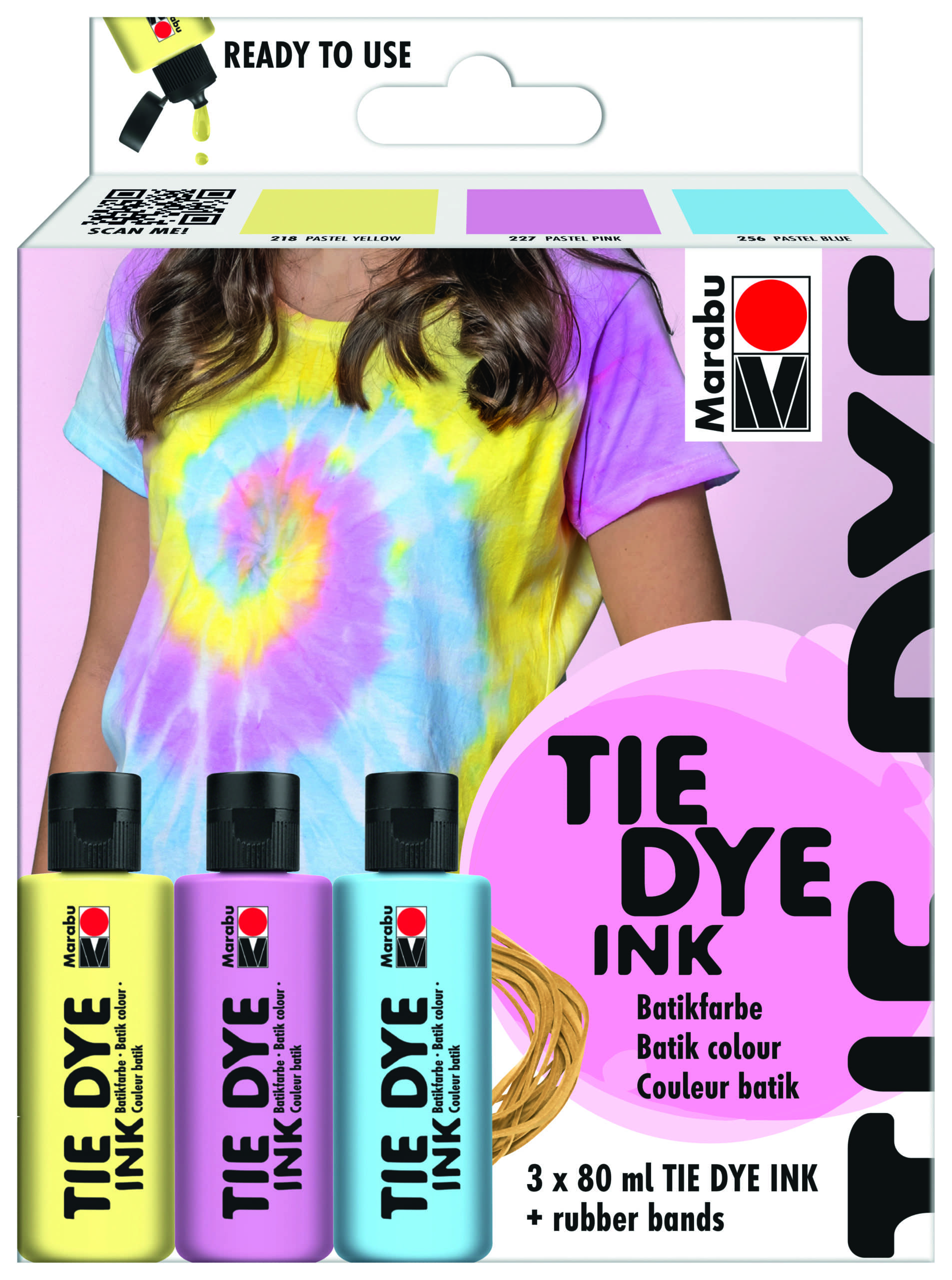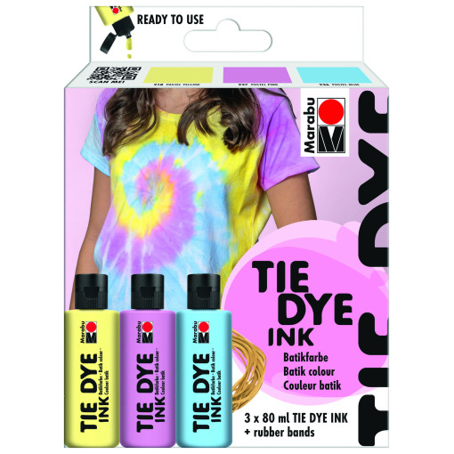 The PASTEL set contains 3 x 80 ml Tie Dye Ink batik ink in pastel yellow, pastel pink and pastel blue as well as rubber bands and instructions. The delicate shades are perfectly coordinated and create harmonious mixtures and color combinations.